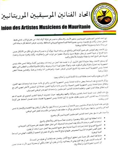 أعرب اتحاد الفنانين الموسيقيين الموريتانيين عن بالغ أسفه واستنكاره لما صدر عن فرقة "أولاد لبلاد" من عمل غنائي وصفه بالهابط والمبتذل، معتبرًا أنه يتنافى مع قيم المجتمع الموريتاني المحافظ، ويخرج عن رسالة الفن السامية ومسؤ