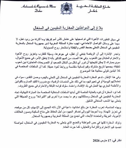 دعت السفارة المغربية في دكار مواطنيها المقيمين في السنغال إلى التحلي بضبط النفس واليقظة، واستشعار روح المسؤولية، وذلك على خلفية مستجدات مرتبطة بمنافسات كأس الأمم الإفريقية.