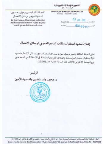أعلنت لجنة تسيير صندوق الدعم العمومي لوسائل الاتصال عن تمديد فترة استقبال ملفات المؤسسات والهيئات الصحفية الراغبة في الحصول على الدعم العمومي للسنة 2025 إلى غاية الجمعة المقبل عند منتصف النهار.