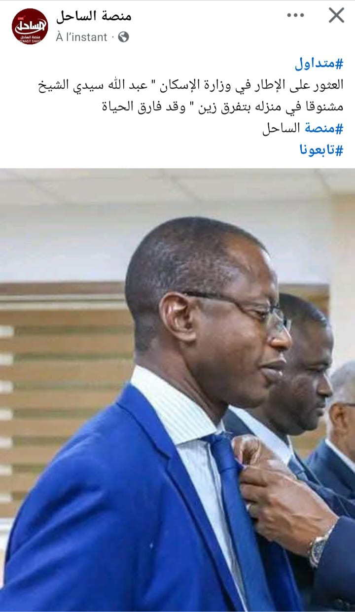 عثر امس اليوم في حيّ سيتي بلاج بنواكشوط الغربية على جثة الإطار بوزارة الإسكان عبدالله سيدي الشيخ مشنوقا بمنزله