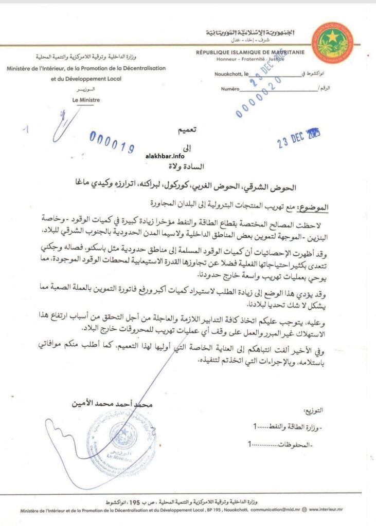أصدر وزير الداخلية وترقية اللامركزية والتنمية المحلية، محمد أحمد ولد محمد الأمين، تعليمات إلى ولاة الولايات الجنوبية والشرقية بضرورة اتخاذ إجراءات صارمة لوقف تهريب الوقود إلى الدول المجاورة.