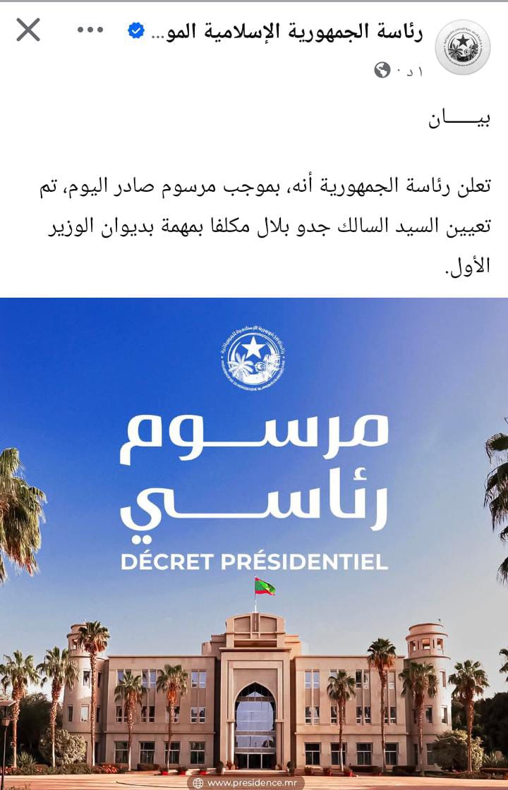 أعلنت رئاسة الجمهورية أنه، بموجب مرسوم صادر اليوم، تم تعيين السيد السالك جدو بلال مكلفا بمهمة بديوان الوزير الأول.