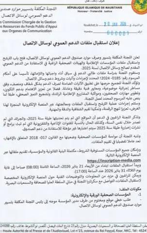 أعلنت اللجنة المكلفة بتسيير وصرف موارد صندوق الدعم العمومي لوسائل الاتصال، فتح باب الترشح واستقبال ملفات المؤسسات الإعلامية والهيئات الصحفية الراغبة في الاستفادة من الدعم العمومي المقدم لصالح وسائل الاتصال لسنة 2025.