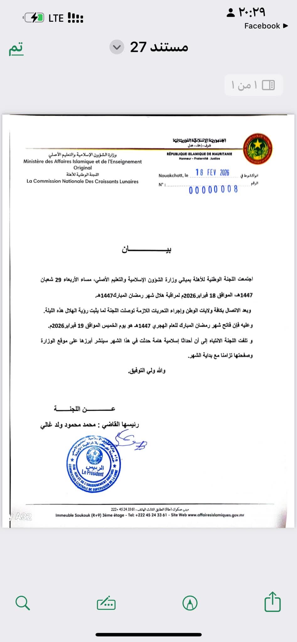 أعلنت اللجنة الوطنية للأهلة ثبوت رؤية هلال شهر رمضان المبارك للعام الهجري 1447هـ، مؤكدة أن يوم الخميس الموافق 19 فبراير 2026م هو فاتح شهر رمضان المبارك.