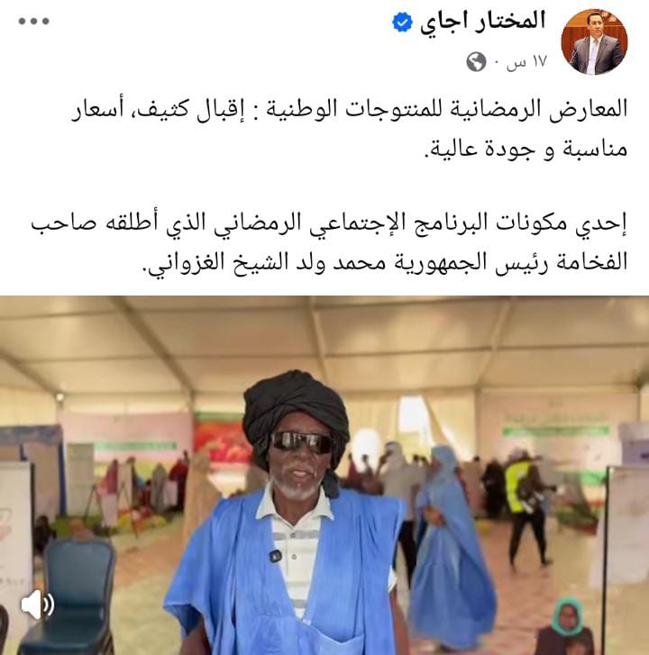 وأضاف الوزير الأول، في تدوينة على صفحته الرسمية بـفيس بوك، أن هذه المعارض تُعد "إحدى مكونات البرنامج الاجتماعي الرمضاني الذي أطلقه صاحب الفخامة الرئيس محمد ولد الشيخ الغزواني".