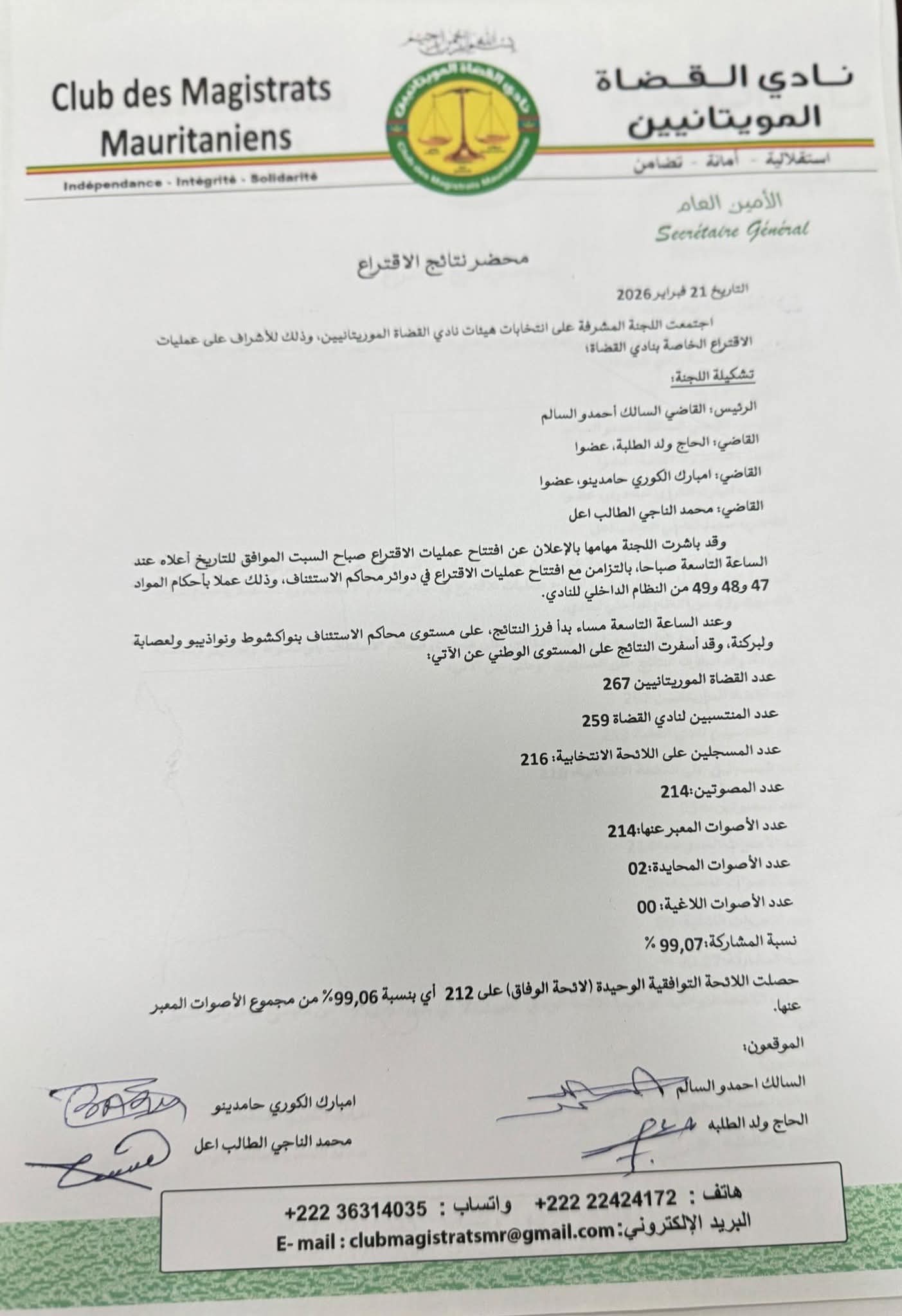 ويبلغ عدد القضاة في موريتانيا 267 قاضيًا، ينتسب منهم 259 إلى النادي، فيما بلغ عدد المسجلين على اللائحة الانتخابية 216 قاضيًا، أدلى منهم 214 بأصواتهم، بينها صوتان محايدان، لتصل نسبة المشاركة إلى 99,07%.