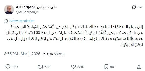 وقال لاريجاني في تغريدة على منصة "X": «إلى دولِ المنطقة: لسنا بصدد الاعتداء عليكم. لكن حين تُستَخدَم القواعد الموجودة في بلدكم ضدّنا، وحين تُنفِّذ الولايات المتحدة عمليات في المنطقة اعتمادًا على قواتها هذه، فإننا سنستهدف تلك القواعد. فهذه القواعد ليست من أرض تلك الدول، بل هي أرض أمريكية».