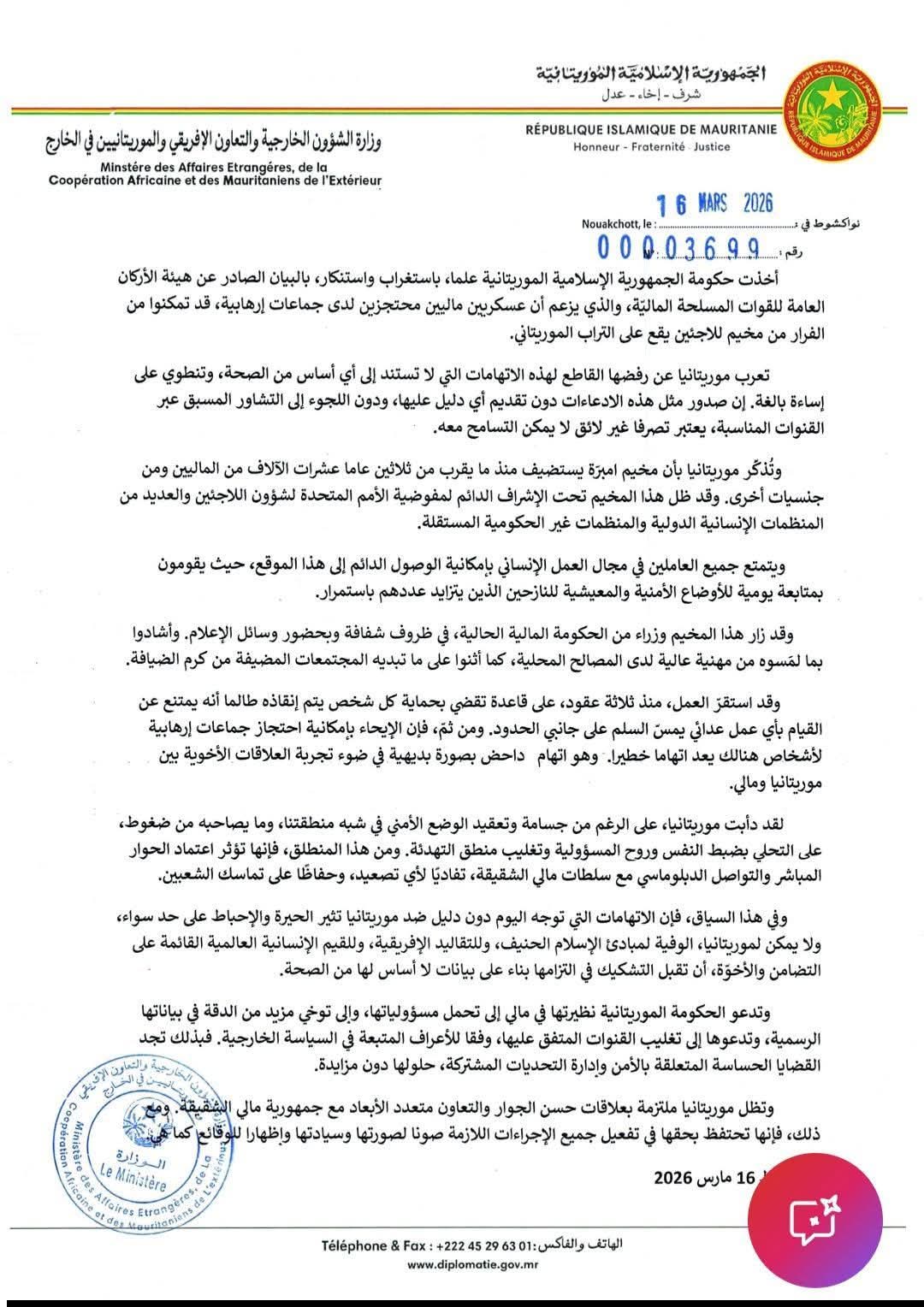 واختتم البيان بالتأكيد على أن موريتانيا تظل ملتزمة بعلاقات حسن الجوار والتعاون متعدد الأبعاد مع جمهورية مالي، مع احتفاظها بحقها في اتخاذ جميع الإجراءات اللازمة لصون صورتها وسيادتها وإظهار الحقائق كما هي.