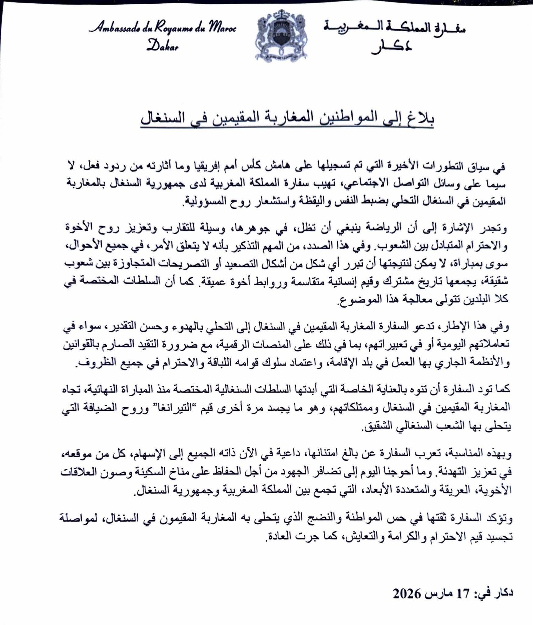 دعت السفارة المغربية في دكار مواطنيها المقيمين في السنغال إلى التحلي بضبط النفس واليقظة، واستشعار روح المسؤولية، وذلك على خلفية مستجدات مرتبطة بمنافسات كأس الأمم الإفريقية.