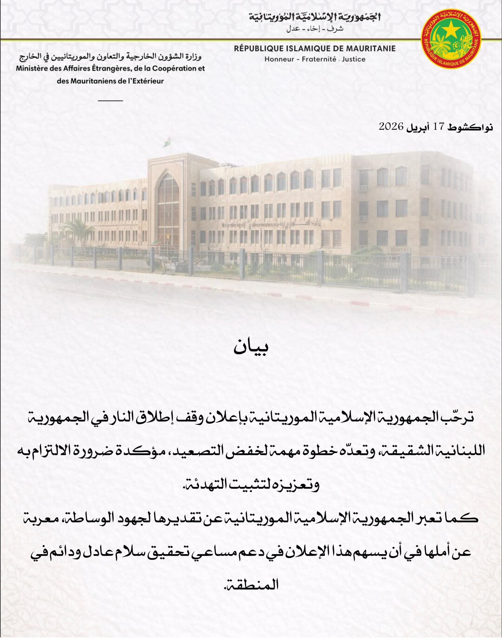 رحبت موريتانيا بإعلان وقف إطلاق النار في لبنان، واعتبرته “خطوة مهمة” من شأنها الإسهام في خفض التصعيد وتهيئة الظروف للتهدئة.