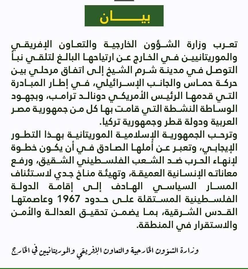 تعرب وزارة الشؤون الخارجية والتعاون الإفريقي والموريتانيين في الخارج عن ارتياحها البالغ لتلقي نبأ التوصل في مدينة شرم الشيخ إلى اتفاق مرحلي بين حركة حماس والجانب الإسرائيلي، في إطار المبادرة التي قدمها الرئيس الأمريكي دونالد ترامب، وبجهود الوساطة النشطة التي قامت بها كل من جمهورية مصر العربية ودولة قطر وجمهورية تركيا.